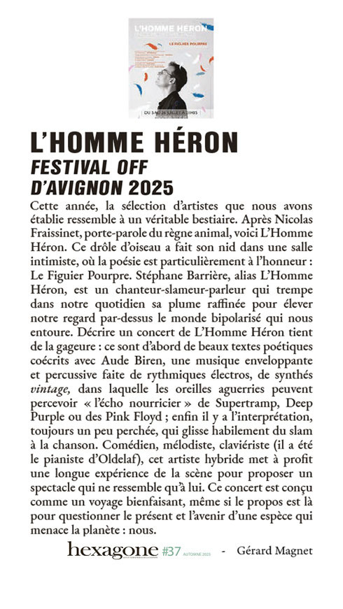 Le Petit Bleu : "...Surprise insolite que cet Homme Héron et son monde. Homme devenu oiseau pour mieux observer, étudier, analyser la société bipède, bricoleur des sons (autour de lui tout un dispositif sonore donne l'impression d'entrer dans une autre dimnesion) Stéphane n'a pas de difficulté à embarquer son public à bord de "sa montgolfière"..."